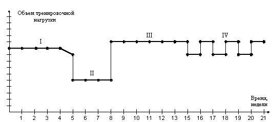 Так может выглядеть условно-графическое изображение нагрузочно-временных параметров активного цикла на уровне начальной тренированности: